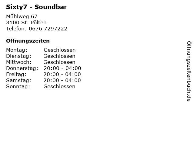 | Öffnungszeiten Sixty7 - Soundbar in St. Pölten anzeigen | |