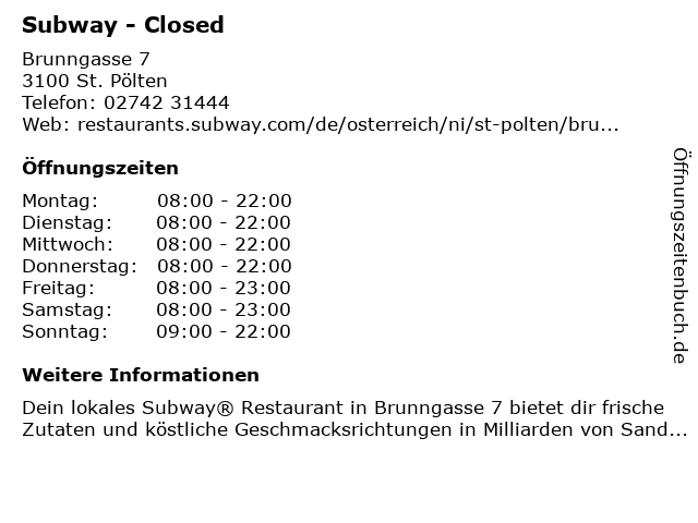| Öffnungszeiten Subway - Closed in St. Pölten anzeigen | |