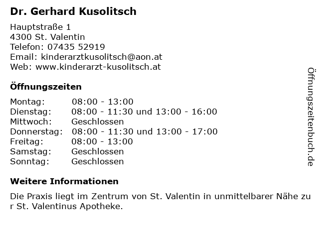 | Öffnungszeiten Dr. Gerhard Kusolitsch in St. Valentin anzeigen | |
