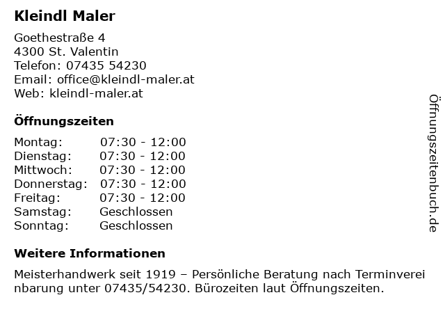 | Öffnungszeiten Kleindl Maler in St. Valentin anzeigen | |