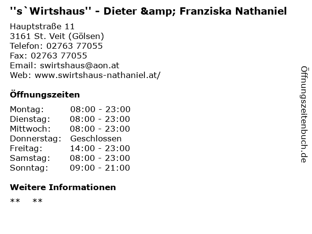 Branchen & Suchbegriffe zu ''s`Wirtshaus'' - Dieter & Franziska Nathaniel:''s`wirtshaus'', **, dieter, essen, franziska, gasthaus, gasthof, gaststätte, gaswtirtschaft, getränke, lokal, mail:, nathaniel, speiselokal, speisen, swirtshaus@aon.at, trinken |