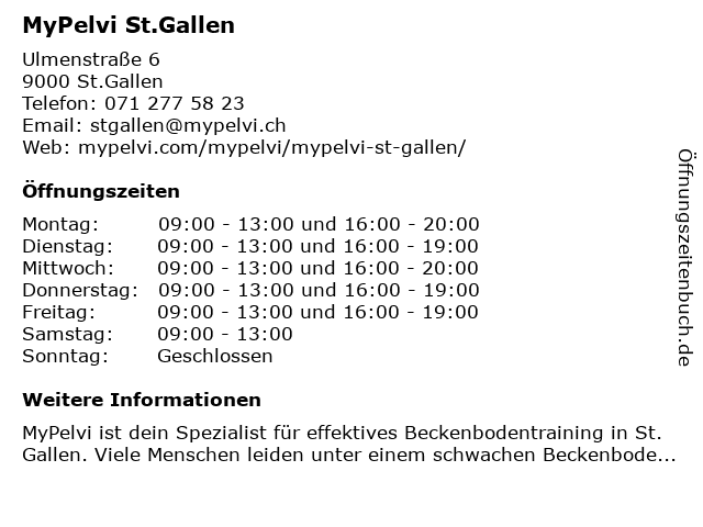 | Öffnungszeiten MyPelvi St.Gallen in St.Gallen anzeigen | |