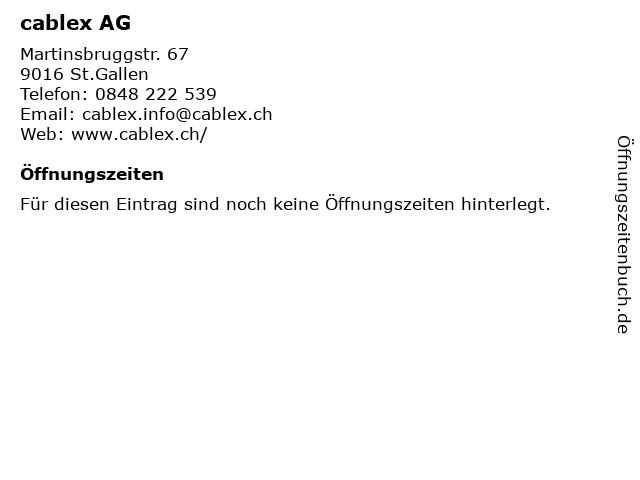 | Öffnungszeiten cablex AG in St.Gallen anzeigen | |