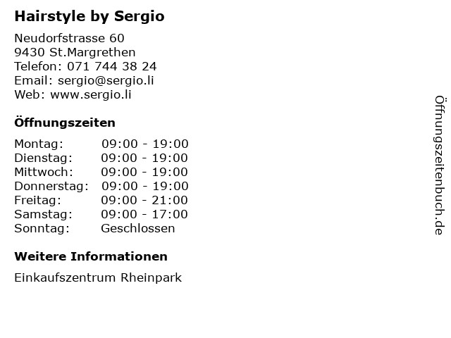 | Öffnungszeiten Hairstyle by Sergio in St.Margrethen anzeigen | |