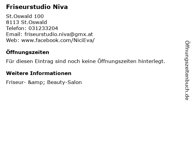| Öffnungszeiten Friseurstudio Niva in St.Oswald anzeigen | |