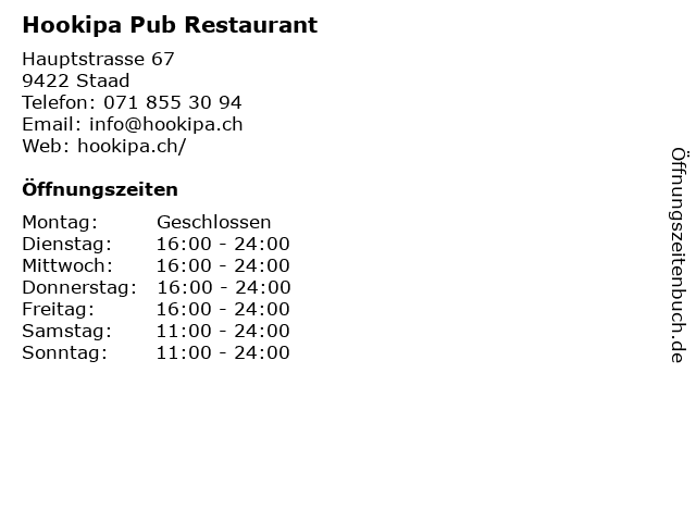 | Öffnungszeiten Hookipa Pub Restaurant in Staad anzeigen | |