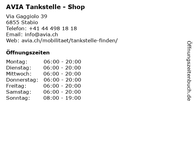 | Öffnungszeiten AVIA Tankstelle - Shop in Stabio anzeigen | |