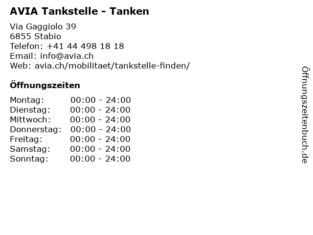| Öffnungszeiten AVIA Tankstelle - Tanken in Stabio anzeigen | |