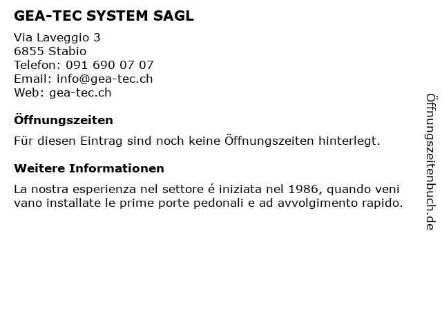 | Öffnungszeiten GEA-TEC SYSTEM SAGL in Stabio anzeigen | |