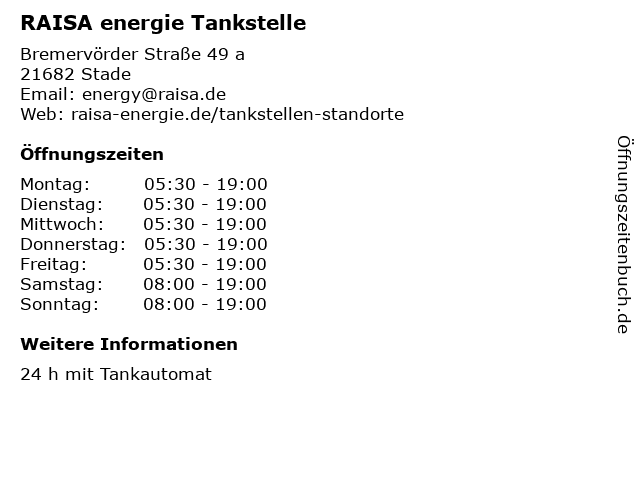 | Öffnungszeiten RAISA energie Tankstelle in Stade anzeigen | |