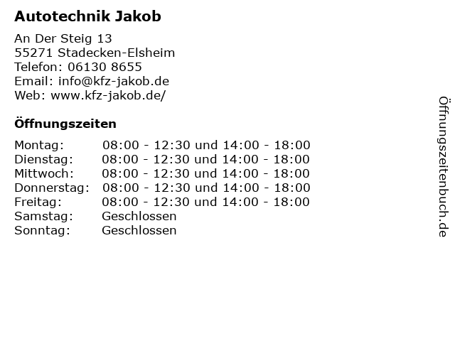 | Öffnungszeiten Autotechnik Jakob in Stadecken-Elsheim anzeigen | |