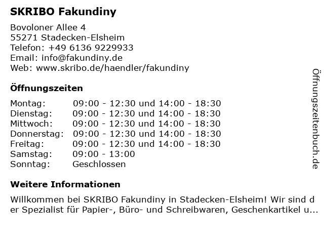 | Öffnungszeiten SKRIBO Fakundiny in Stadecken-Elsheim anzeigen | |