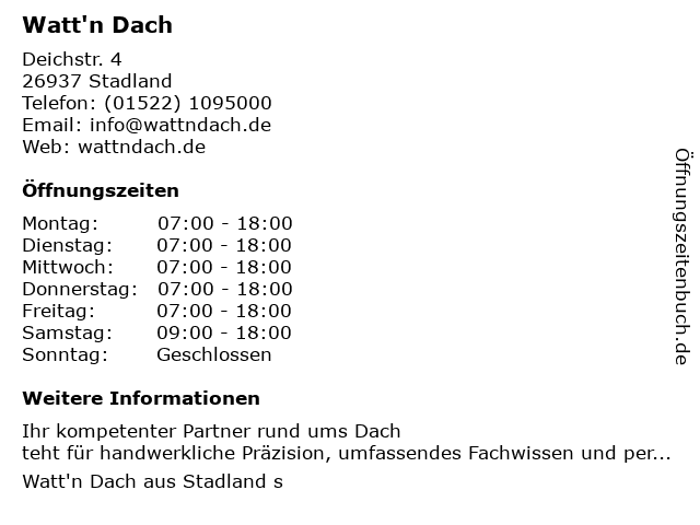 | Telefonnummer Watt'n Dach in Stadland ((01522) 1095000) anrufen | |