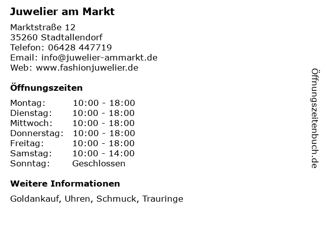 | Öffnungszeiten Juwelier am Markt in Stadtallendorf anzeigen | |
