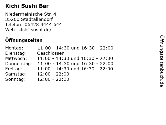 | Öffnungszeiten Kichi Sushi Bar in Stadtallendorf anzeigen | |
