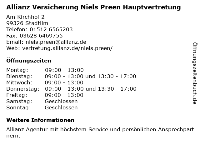 1 Allianz Versicherung Anja Hiersche Hauptvertretung (Entfernung: 0,30 km) Lindenstraße 7, 99326 Stadtilm 2 Allianz Versicherung Petra Lipsius Hauptvertretung (Entfernung: 12,09 km) Alexanderstraße 19, 99448 Kranichfeld 3 Allianz Versicherung Benjamin Dunkel Hauptvertretung (Entfernung: 12,76 km) Weberstraße 4, 07426 Königsee 4 Allianz Versicherung Ute Neumeister Hauptvertretung (Entfernung: 12,89 km) Schwarzburger Straße 34, 07426 Königsee 5 Allianz Versicherung Franz König Hauptvertretung (Entfernung: 15,26 km) Weimarer Straße 12, 98693 Ilmenau 6 Allianz Versicherung Andreas Böhmert Hauptvertretung (Entfernung: 15,49 km) Burggasse 26, 98693 Ilmenau |