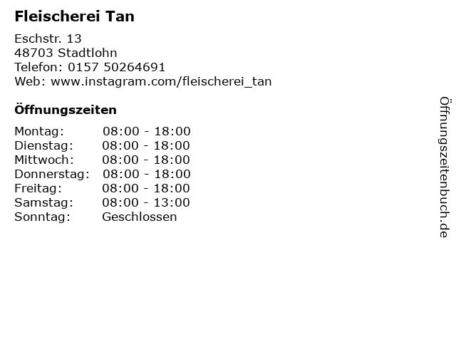 | Öffnungszeiten Fleischerei Tan in Stadtlohn anzeigen | |