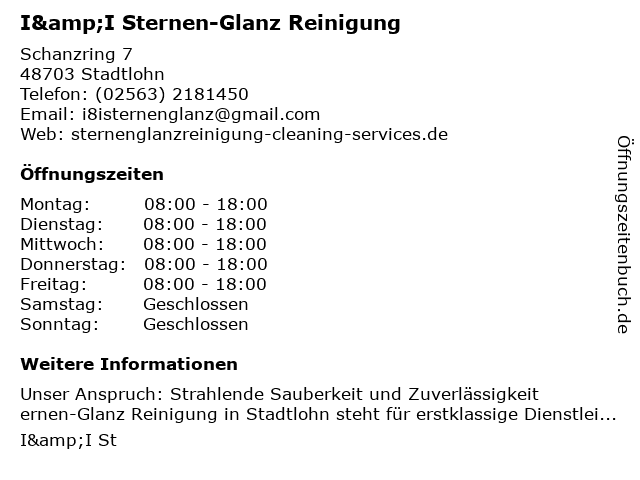 Branchen & Suchbegriffe zu I&I Sternen-Glanz Reinigung:büroraumreinigung, call-center-reinigung, gewerbliche unterhaltsreinigung, glanz, i&i, reinigung, sternen, sternen-glanz, tägliche unterhaltsreinigung |