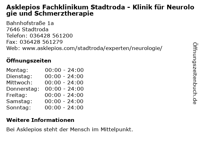Branchen & Suchbegriffe zu Asklepios Fachklinikum Stadtroda - Klinik für Neurologie und Schmerztherapie:asklepios, fachklinikum, klinik, neurologie, schmerztherapie |