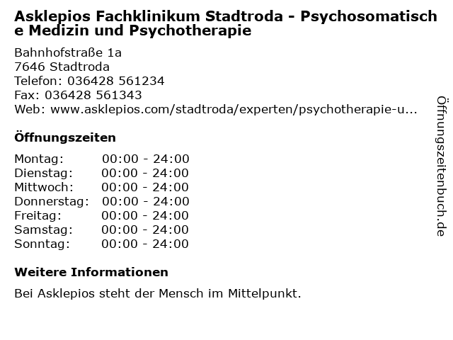 Branchen & Suchbegriffe zu Asklepios Fachklinikum Stadtroda - Psychosomatische Medizin und Psychotherapie:asklepios, fachklinikum, medizin, psychosomatische, psychotherapie |