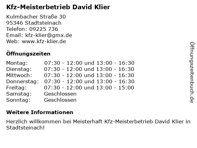 1 KFZ-Werkstatt & Meisterbetrieb Dieter Pöhlmann e.K. (Entfernung: 5,08 km) Grafendobrach 24, 95326 Kulmbach 4 Sanitärinstallationen & Schlosserei - Klier (Entfernung: 8,88 km) Marienweiher 17, 95352 Marktleugast 6 KFZ-Technik Meisterbetrieb Hofmann (Entfernung: 9,50 km) Stadtsteinacher Straße 30, 96364 Marktrodach |