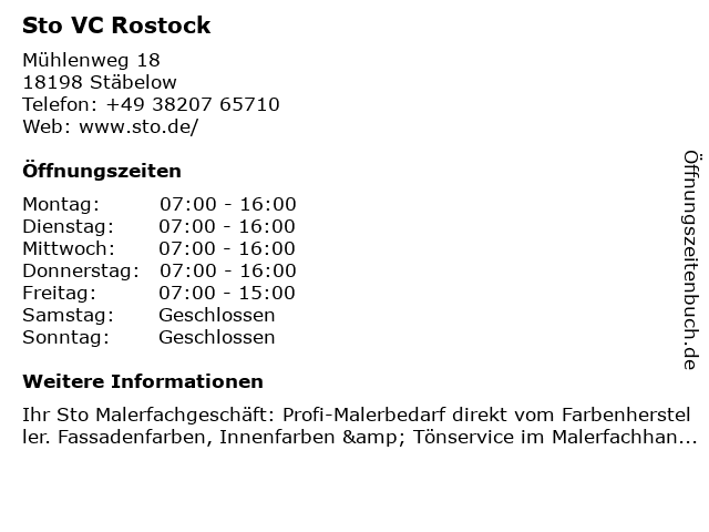| Öffnungszeiten Sto VC Rostock in Stäbelow anzeigen | |