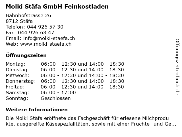 | Öffnungszeiten Molki Stäfa GmbH Feinkostladen in Stäfa anzeigen | |