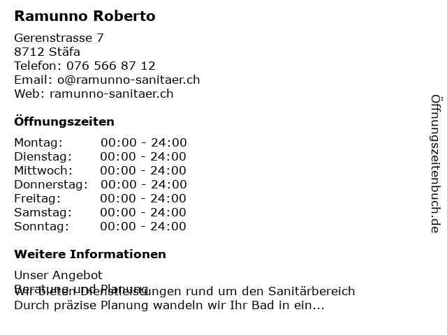 | Öffnungszeiten Ramunno Roberto in Stäfa anzeigen | |