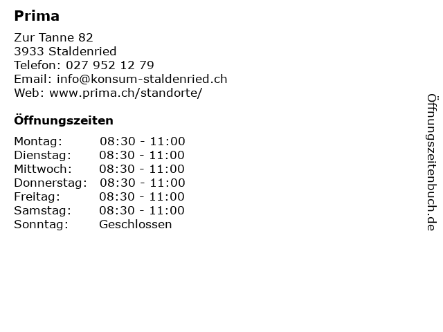 | Öffnungszeiten Prima in Staldenried anzeigen | |