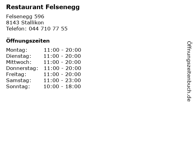 | Öffnungszeiten Restaurant Felsenegg in Stallikon anzeigen | |