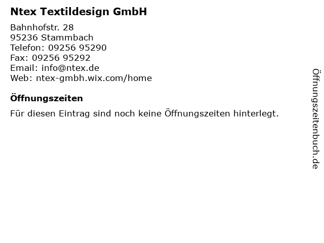 | Öffnungszeiten Ntex Textildesign GmbH in Stammbach anzeigen | |