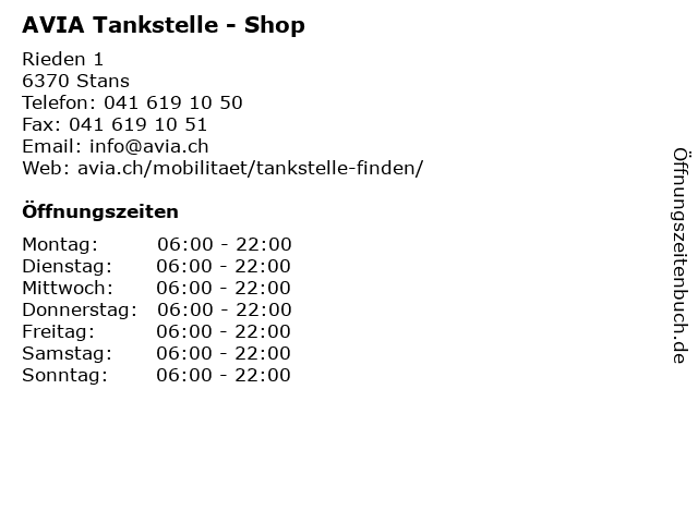 | Öffnungszeiten AVIA Tankstelle - Shop in Stans anzeigen | |