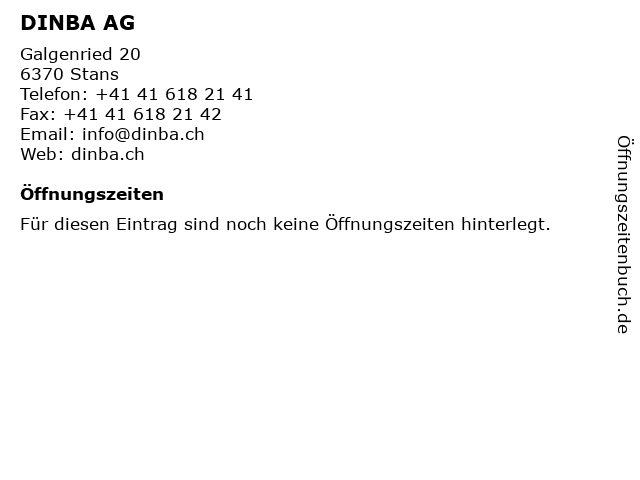 | Öffnungszeiten DINBA AG in Stans anzeigen | |