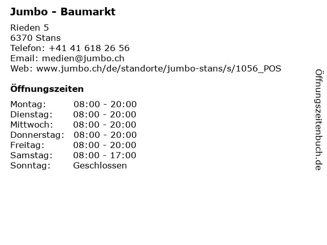 | Öffnungszeiten Jumbo - Baumarkt in Stans anzeigen | |