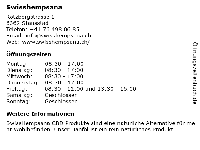 | Öffnungszeiten Swisshempsana in Stansstad anzeigen | |