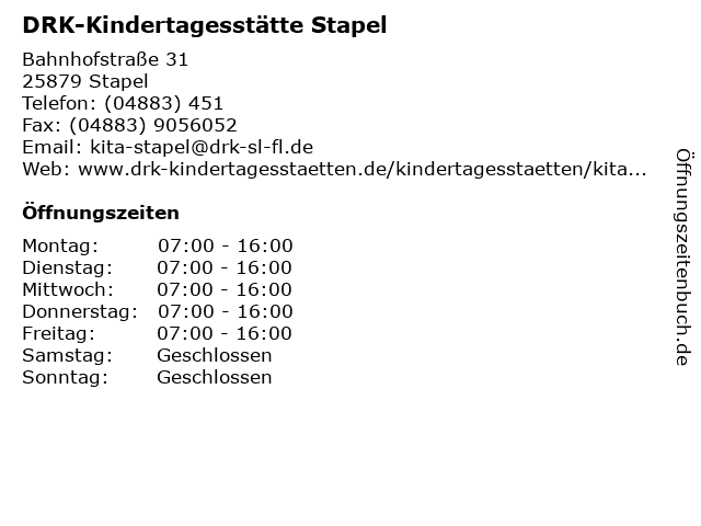 | Öffnungszeiten DRK-Kindertagesstätte Stapel in Stapel anzeigen | |