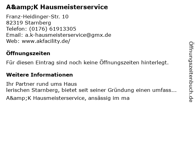 | Öffnungszeiten A&K Hausmeisterservice in Starnberg anzeigen | |