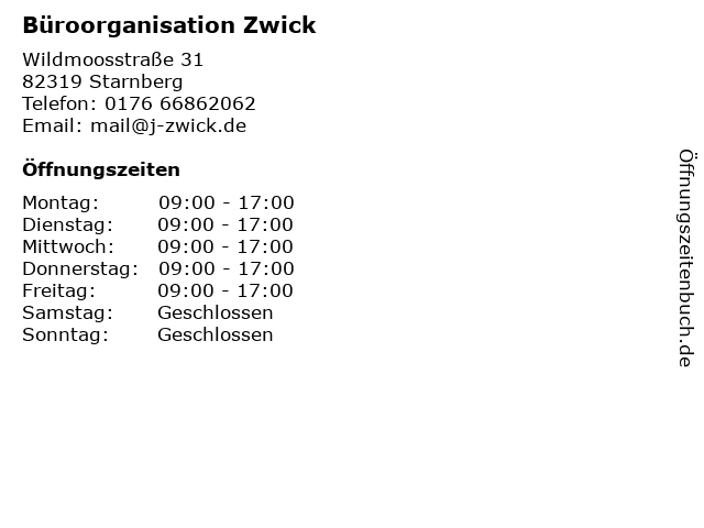 | Öffnungszeiten Büroorganisation Zwick in Starnberg anzeigen | |