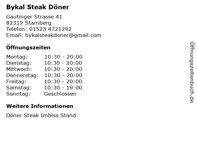 | Öffnungszeiten Bykal Steak Döner in Starnberg anzeigen | |