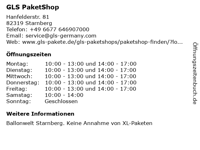 | Telefonnummer GLS PaketShop in Starnberg (+49 6677 646907000) anrufen | |