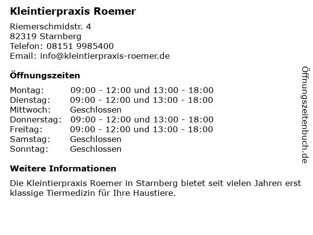 | Öffnungszeiten Kleintierpraxis Roemer in Starnberg anzeigen | |
