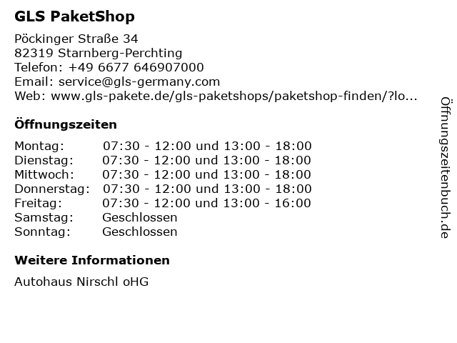 | Öffnungszeiten GLS PaketShop in Starnberg-Perchting anzeigen | |