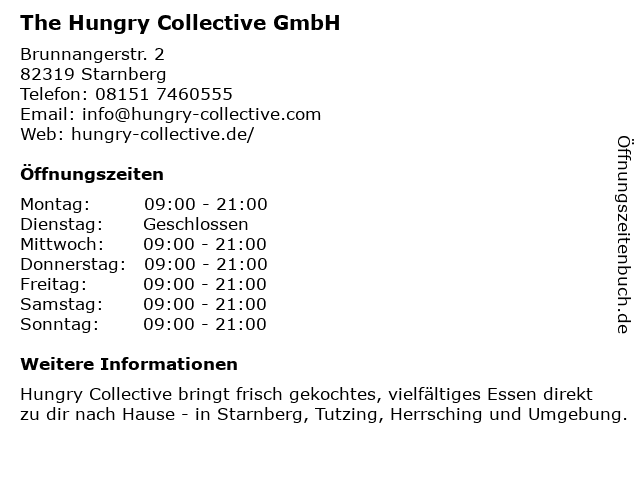 | Öffnungszeiten The Hungry Collective GmbH in Starnberg anzeigen | |