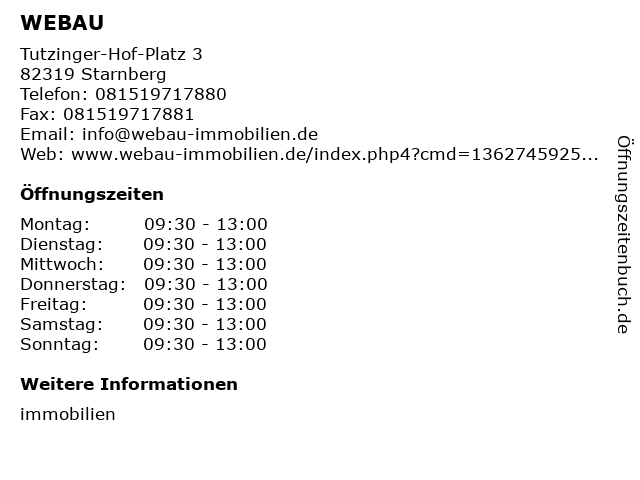 | Öffnungszeiten WEBAU in Starnberg anzeigen | |