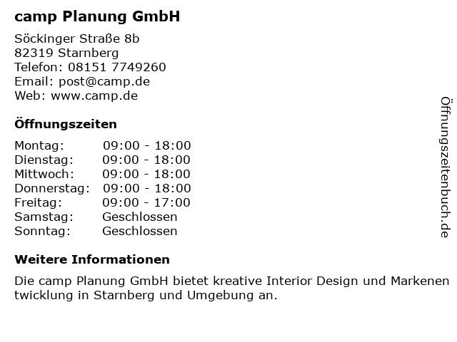 | Öffnungszeiten camp Planung GmbH in Starnberg anzeigen | |