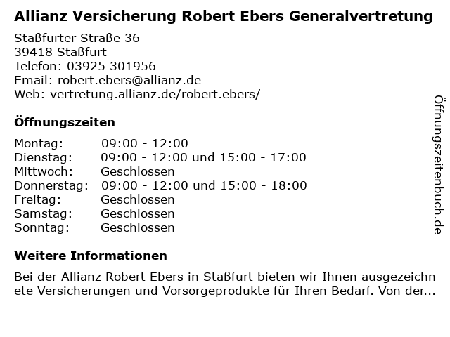 1 Allianz Versicherung Robert Ebers Generalvertretung (Entfernung: 11,38 km) Wilhelmstraße 34, 06449 Aschersleben 2 Allianz Versicherung - Generalvertretung Gabriele Erdmann-Golinskee.K. (Entfernung: 2,58 km) Heinrich-Zille-Str. 10, 39418 Staßfurt 3 Allianz Versicherung Patrick Schliwa Generalvertretung (Entfernung: 3,06 km) Steinstraße 29, 39418 Staßfurt 4 Allianz Generalvertretung Daniel Schröder (Entfernung: 5,85 km) Staßfurter Str. 12 b, 39446 Löderburg 5 Robert Wittenbeck Bezirksleiter Baufi Schwäbisch Hall (Entfernung: 11,09 km) Herrenbreite 32, 06449 Aschersleben 6 Mecklenburgische Versicherungsgruppe - Generalvertretung Silke Brütting (Entfernung: 11,49 km) Markt 5, 06406 Bernburg |
