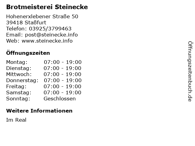 | Öffnungszeiten Brotmeisterei Steinecke in Staßfurt anzeigen | |