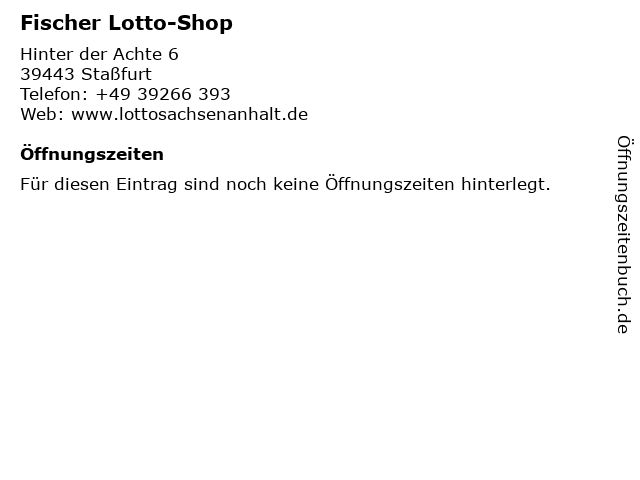 | Öffnungszeiten Fischer Lotto-Shop in Staßfurt anzeigen | |