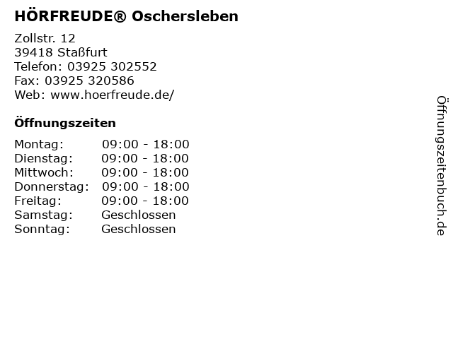 | Öffnungszeiten HÖRFREUDE® Oschersleben in Staßfurt anzeigen | |