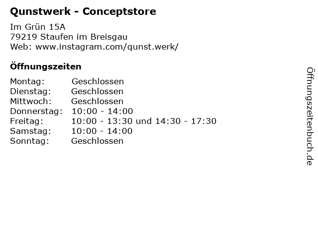 | Öffnungszeiten Qunstwerk - Conceptstore in Staufen im Breisgau anzeigen | |